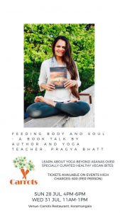 And I ended the week with updates about my first book event for ‘Beyond Asanas’. The event is called ‘Feeding Body and Soul – A Book Talk. It is being hosted by Carrots Restaurant and they even curated a special menu for it!!! The menu included: Melon Mint Gazpacho, Raw Beetroot Ravioli with Herbed Cheese and Cilantro Hummus with Baked Lavash Chips. Exciting stuff!!! The first event was on Sunday evening and I spoke about my personal journey, why yoga, how I went about writing the book etc. It was an open, free-wheeling discussion and I look forward to doing the event again on Wednesday the 31st of July. Fingers crossed that this is the first of many book events. 🙂