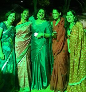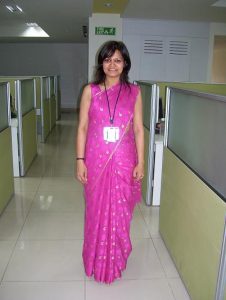 At an Infosys event in one of the first saris I bought for myself. I got it at Deepams on MG Road, and loved the colors and the golden apostrophes peppering the entire sari.