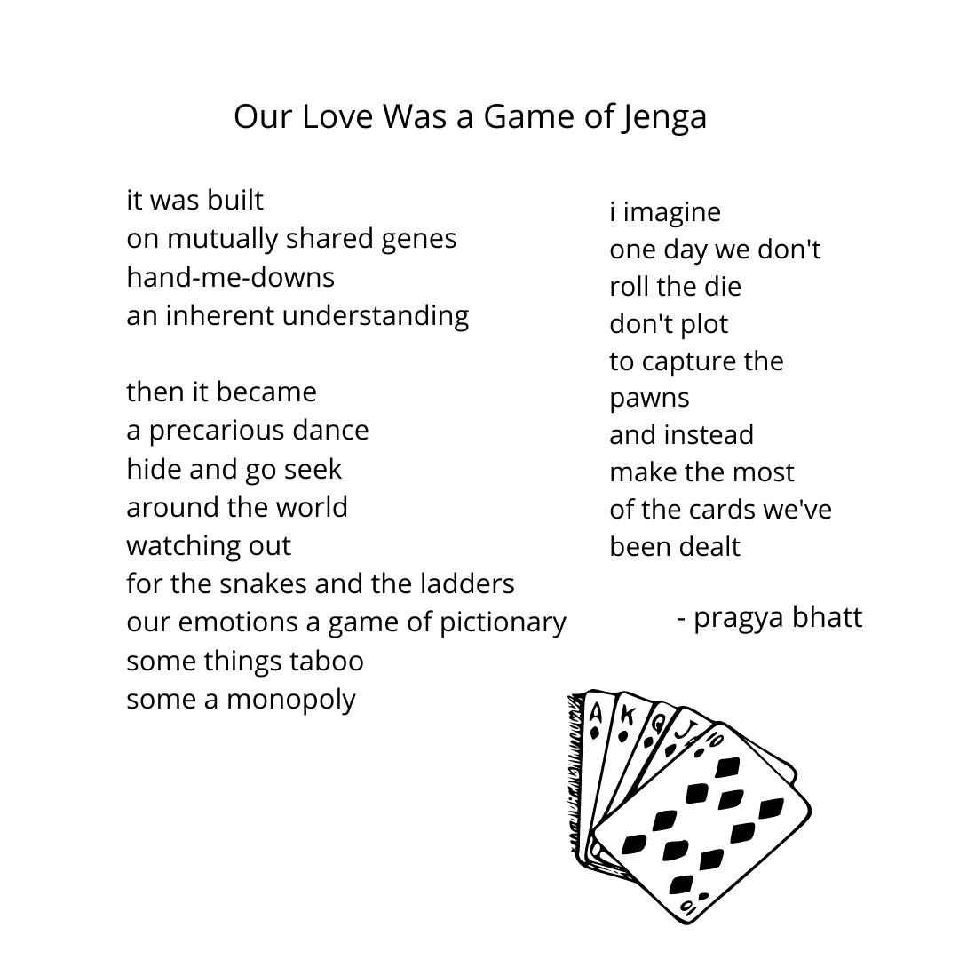 Poetry Our Love Was a Game of Jenga #NaPoWriMo2021 Day 4 April 10, 2021 Prompt: Our Love Was a Game of Jenga [This poem is a response to the NaPoWriMo (National Poetry Writing Month) prompt.] Like this:Like Loading... Post navigation « PreviousNext » jenganapowrimonational poetry writing monthpoems about gamespoems about jengapragya bhatt poetry 0 Comments Pragya Bhatt writer. yoga teacher. stretcher of limbs. collector of odd bookmarks. obsessive reader. keeper of many diaries. chocolate aficionado. You Might Also Like Soft April 1, 2024 Prompt 21: Birdsong April 21, 2022 Prompt 12: Memory Loss April 12, 2022 No Comments Leave a Reply Cancel ReplyName * Email * Website