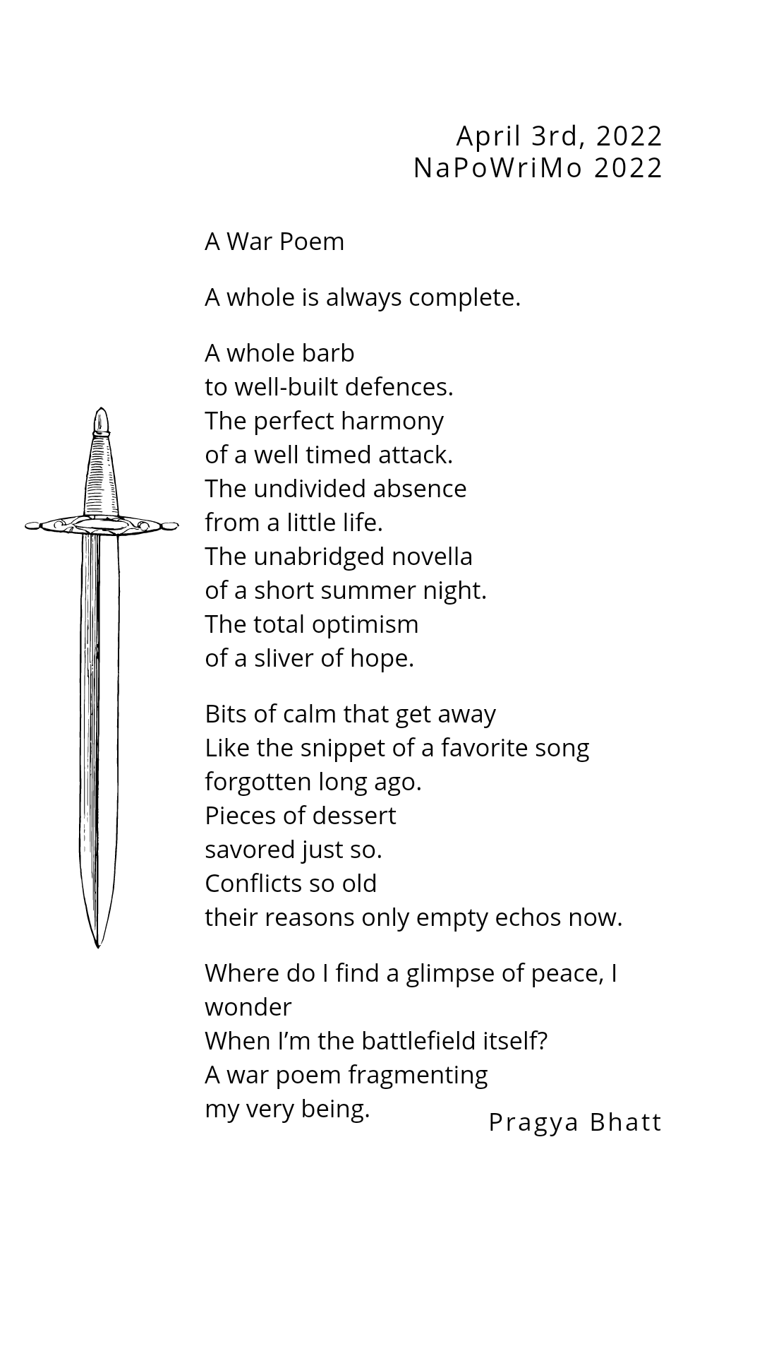 Poetry Prompt 3: A War Poem April 3, 2022 Like this:Like Loading... Post navigation « PreviousNext » #WordsMatterindian poetsnapowrimo2022 0 Comments Pragya Bhatt writer. yoga teacher. stretcher of limbs. collector of odd bookmarks. obsessive reader. keeper of many diaries. chocolate aficionado. You Might Also Like It’s Not That Time of the Year Without… October 6, 2019 Prompt 1: Cake April 1, 2022 Prompt 9: A palindrome poem April 10, 2022 No Comments Leave a Reply Cancel ReplyName * Email * Website