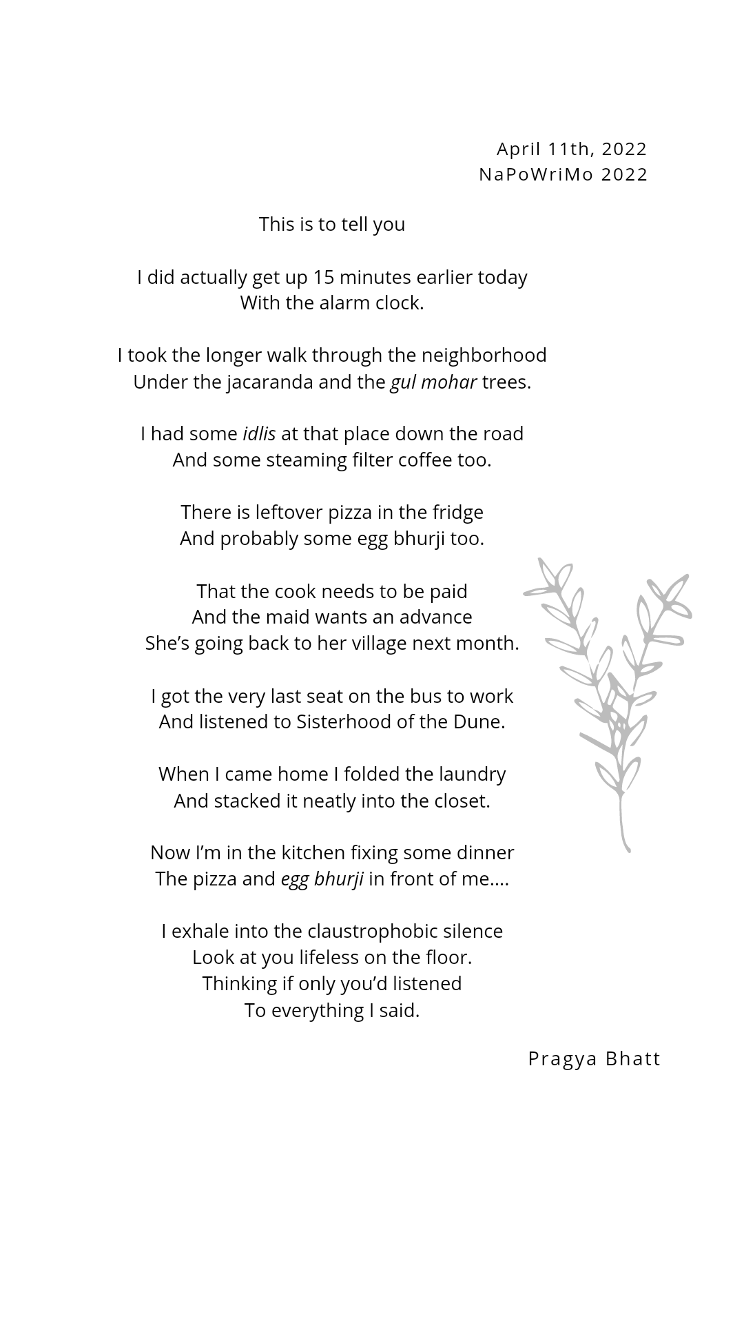 Poetry Prompt 11: This is to tell you April 11, 2022 Like this:Like Loading... Post navigation « PreviousNext » best indian poetrynapowrimo2022poetry blogscary poems 0 Comments Pragya Bhatt writer. yoga teacher. stretcher of limbs. collector of odd bookmarks. obsessive reader. keeper of many diaries. chocolate aficionado. You Might Also Like Soft April 1, 2024 Prompt 15: Rewilding April 16, 2022 Prompt 29: Wallflower May 2, 2022 No Comments Leave a Reply Cancel ReplyName * Email * Website