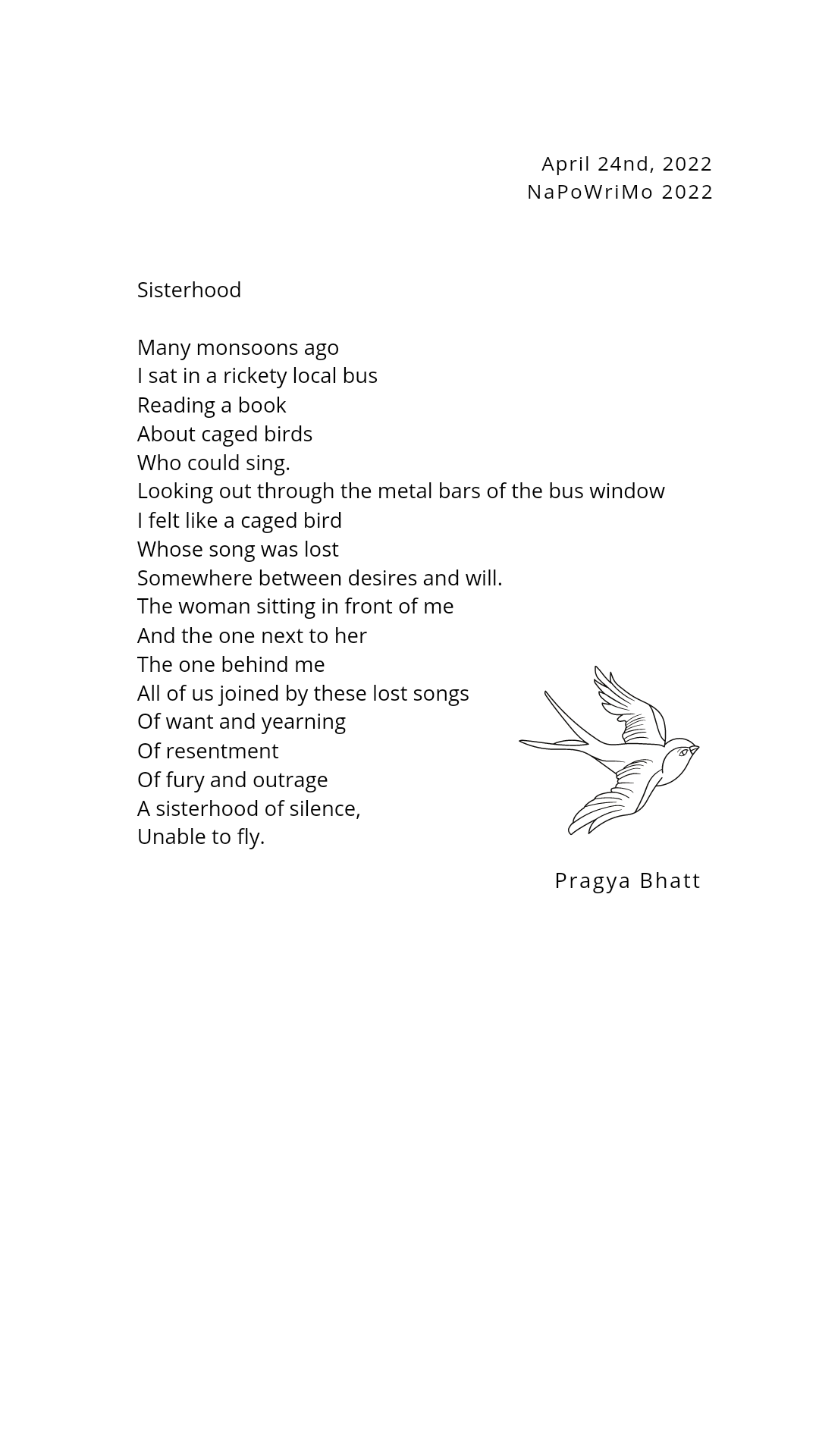 Poetry Prompt 24: Sisterhood April 27, 2022 Like this:Like Loading... Post navigation « PreviousNext » best poetry blogindian poetrynational poetry writing monthPoems about sisters 0 Comments Pragya Bhatt writer. yoga teacher. stretcher of limbs. collector of odd bookmarks. obsessive reader. keeper of many diaries. chocolate aficionado. You Might Also Like Prompt 22: Theory April 23, 2022 Prompt 14: Nurture April 14, 2022 Prompt 9: A palindrome poem April 10, 2022 No Comments Leave a Reply Cancel ReplyName * Email * Website