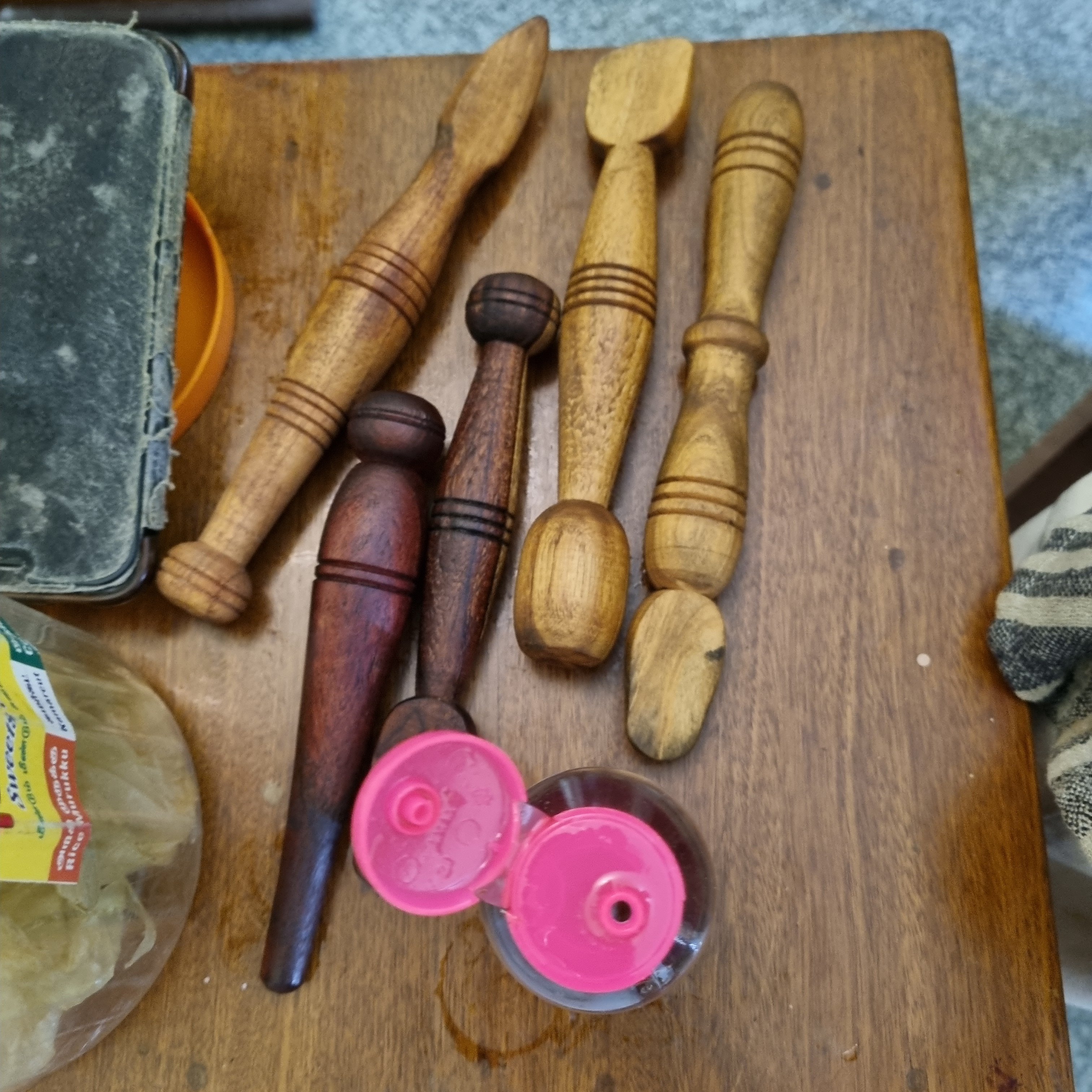 Tools used to activate various points on the foot.. This reflexology massage can be excruciatingly painful, and he uses several wooden tools and oils.