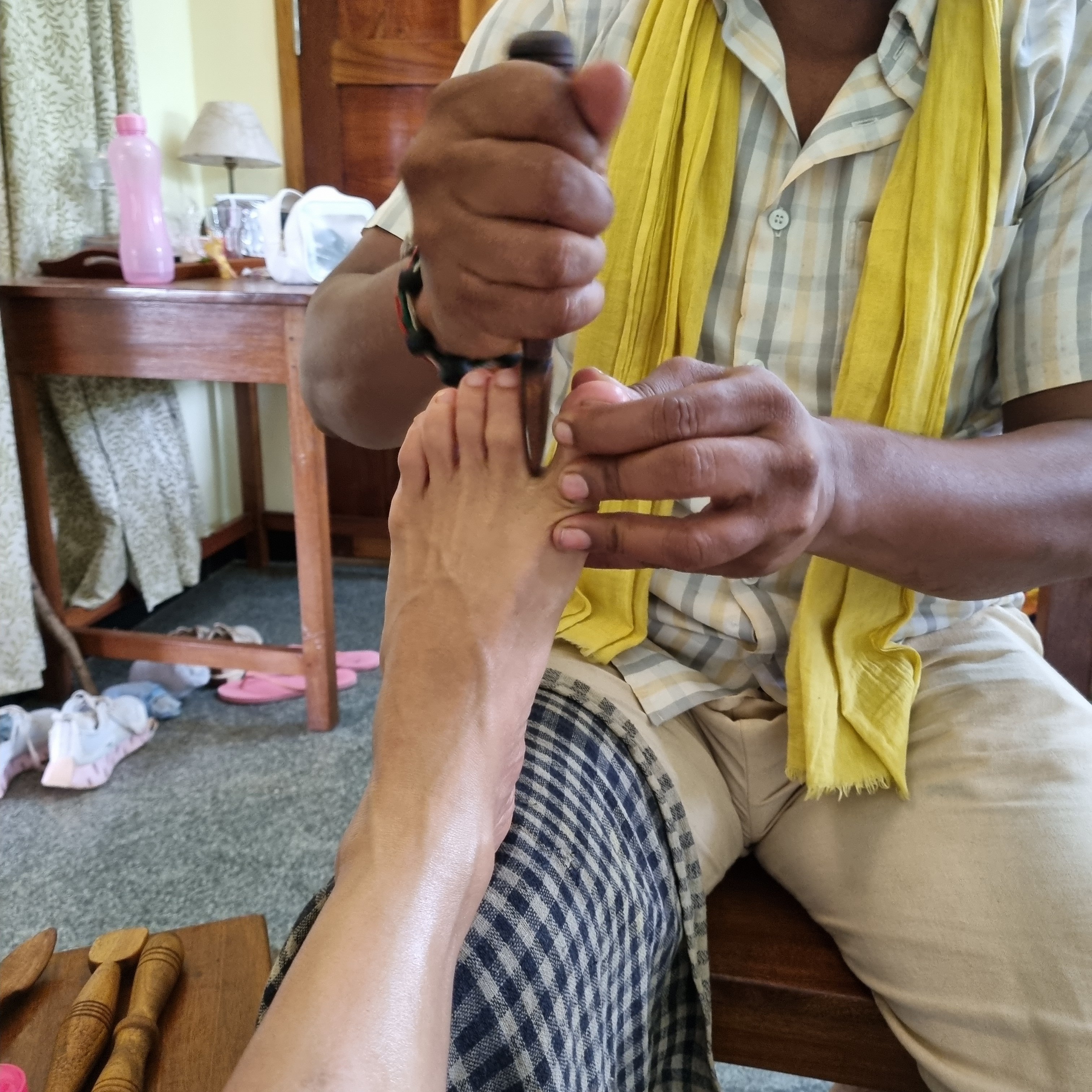 On the way back from Kalarigram, Sowmya took us to visit a talented sidhar she had met on her previous visit. He practices in a small tin hut next to a nondescript road in Auroville. All of us were interested in his therapy and we arranged for him to visit our guest house. He uses reflexology as a diagnostic tool, and then prescribes traditional herbal medicine accordingly.