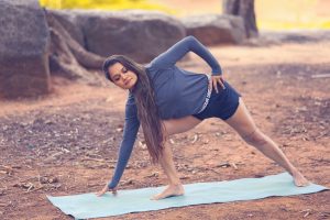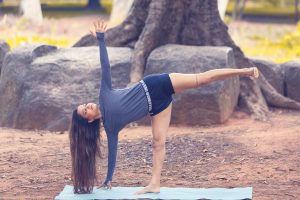 The Ardha Chandrasana made the cut. I found a connection between this asana and the story of the near-destruction of the universe. When Shiva swallowed the halahala to save the Universe, the poison turned his body blue. Chandra stepped in to help.