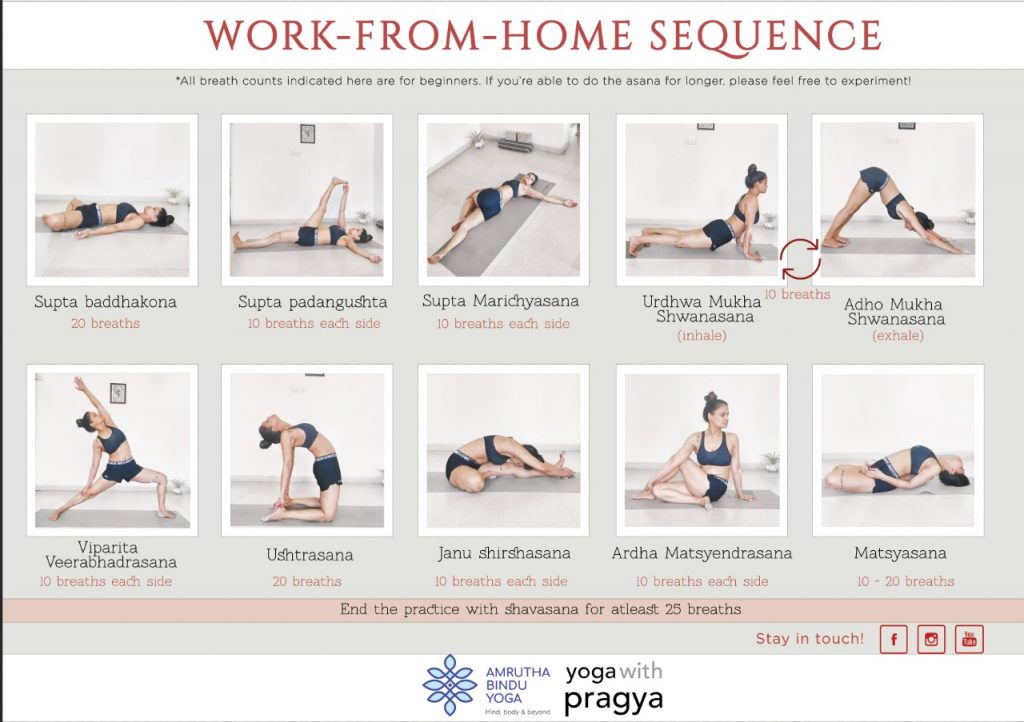 I’m doing this challenge in collaboration with Medha Bhaskar from Amrutha Bindu Yoga. Our last challenge was a huge success and we decided to make this one bigger and better. This time we’ve curated a “Work-from-Home” Yoga sequence that will help to loosen your joints, free your back and minimize your discomfort throughout the day, making it easier for you to focus on work. This sequence, in particular, works entirely on keeping your spine supple and ready and your mind, sharp.