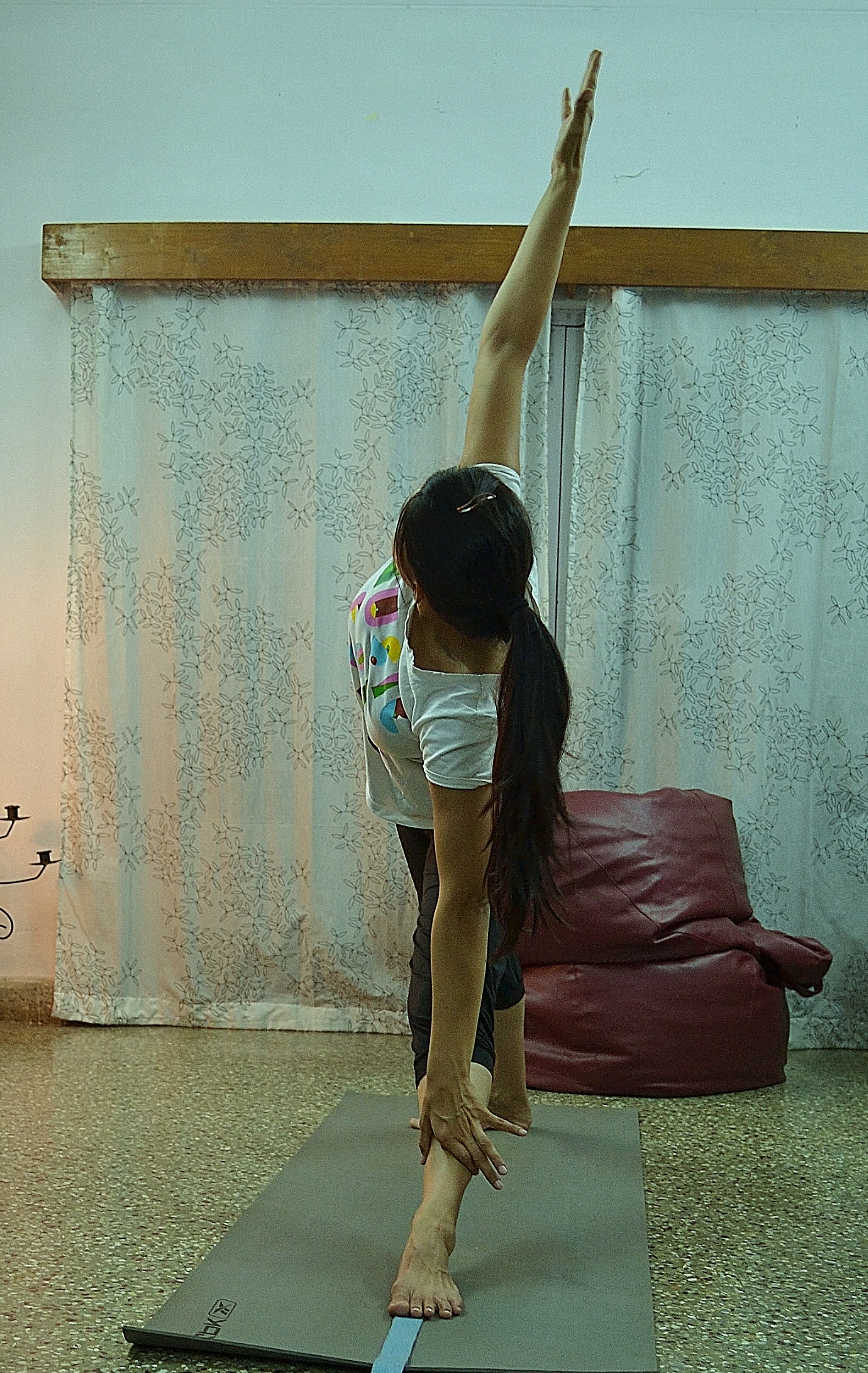 4. Now exhale and start to turn you torso so that your right hand reaches the floor. Since you want to make sure that your shoulders are aligned, your chest open and there is minimum strain on your neck, you can use a block to give you a bit of elevation. As in the Trikonasana, make sure that your spine is extended.