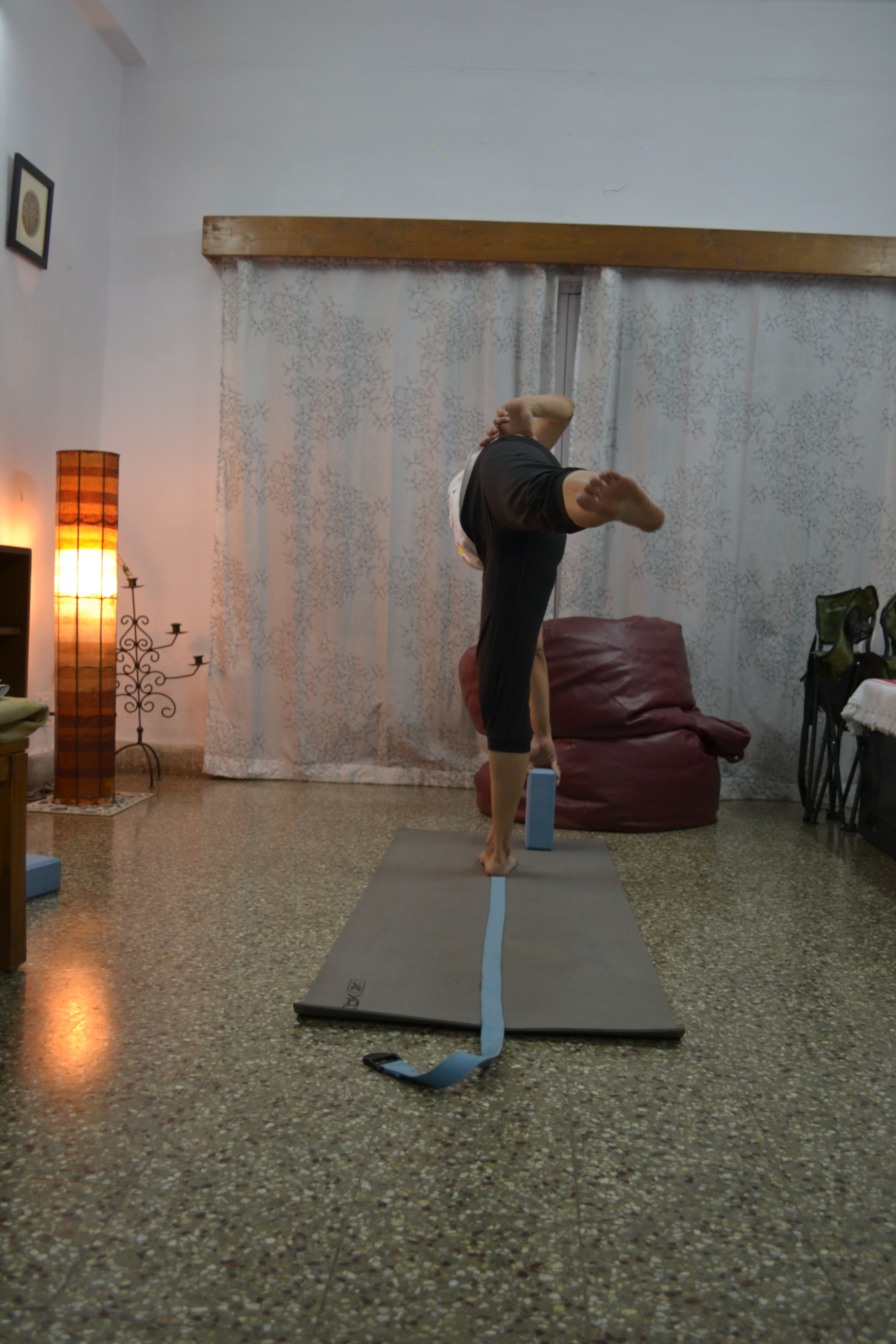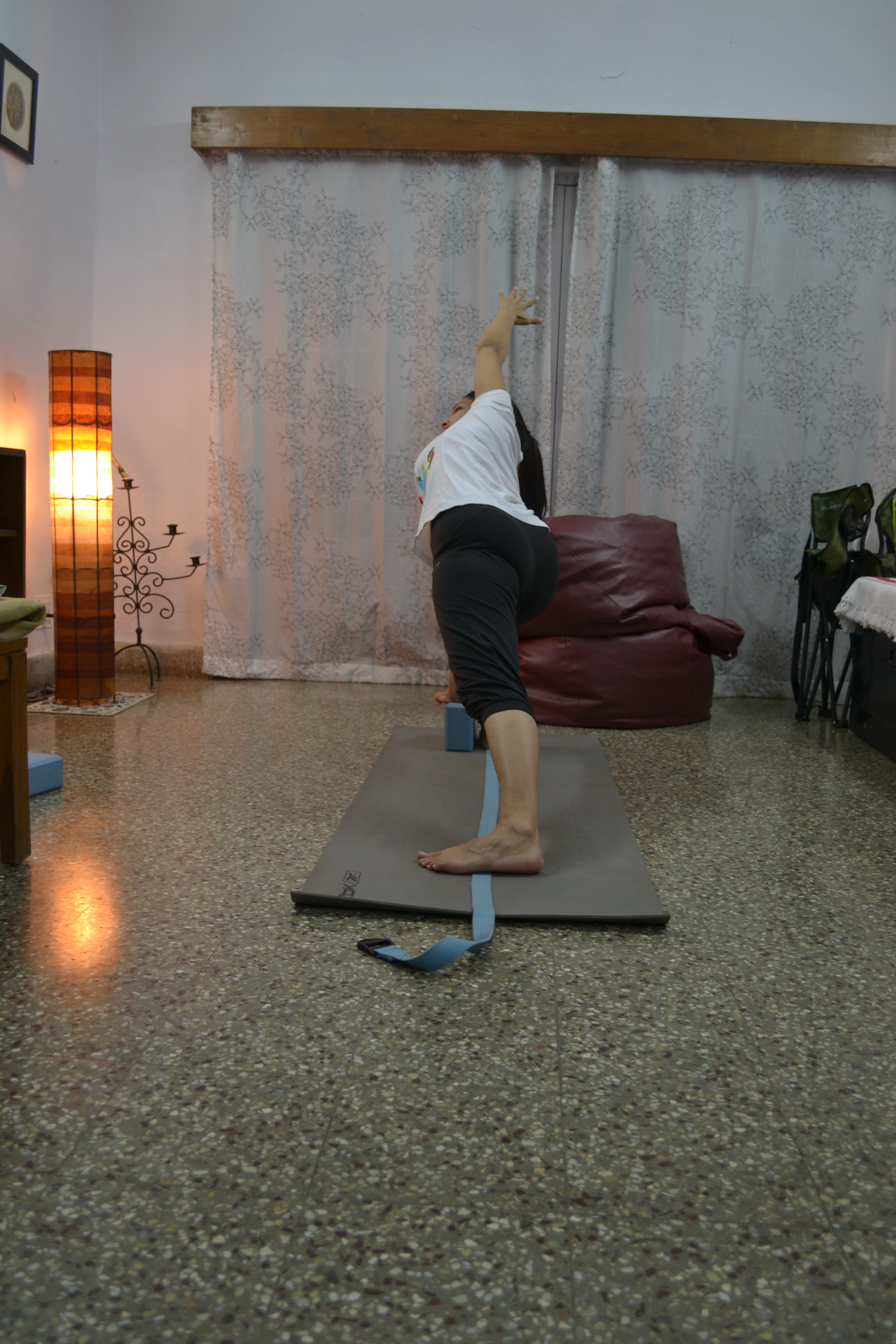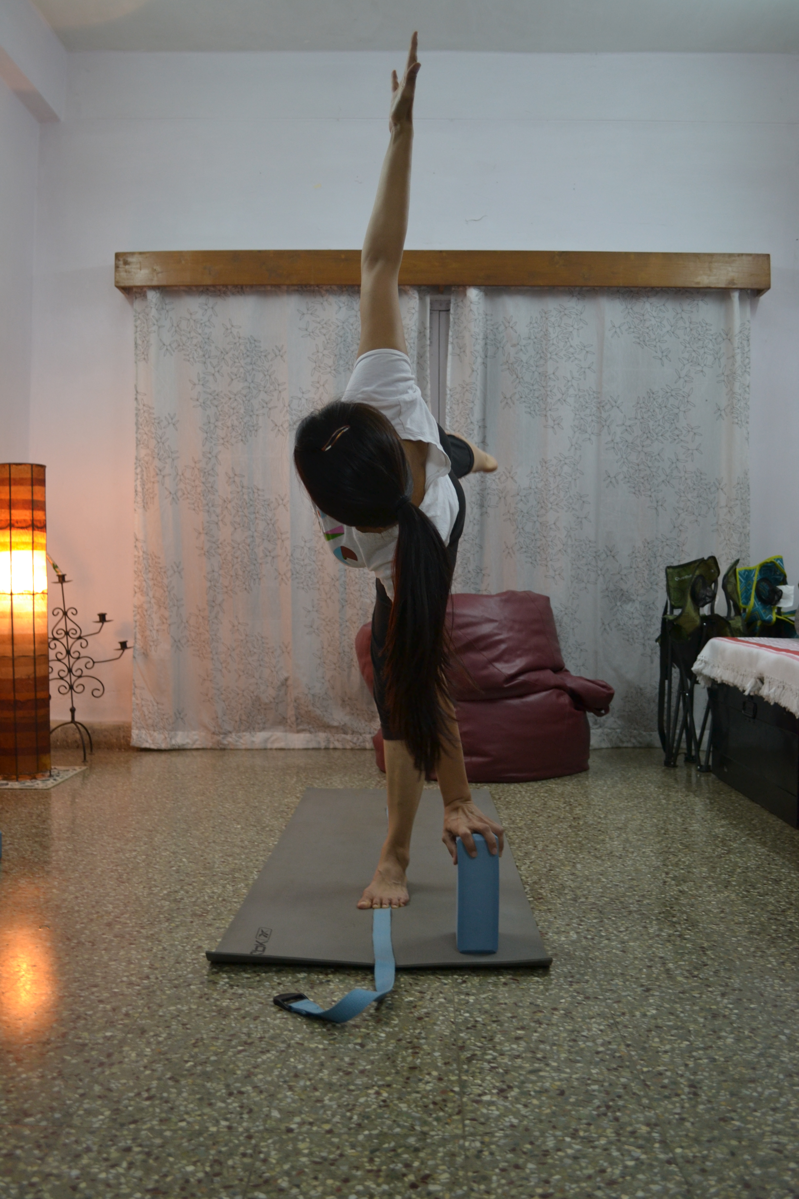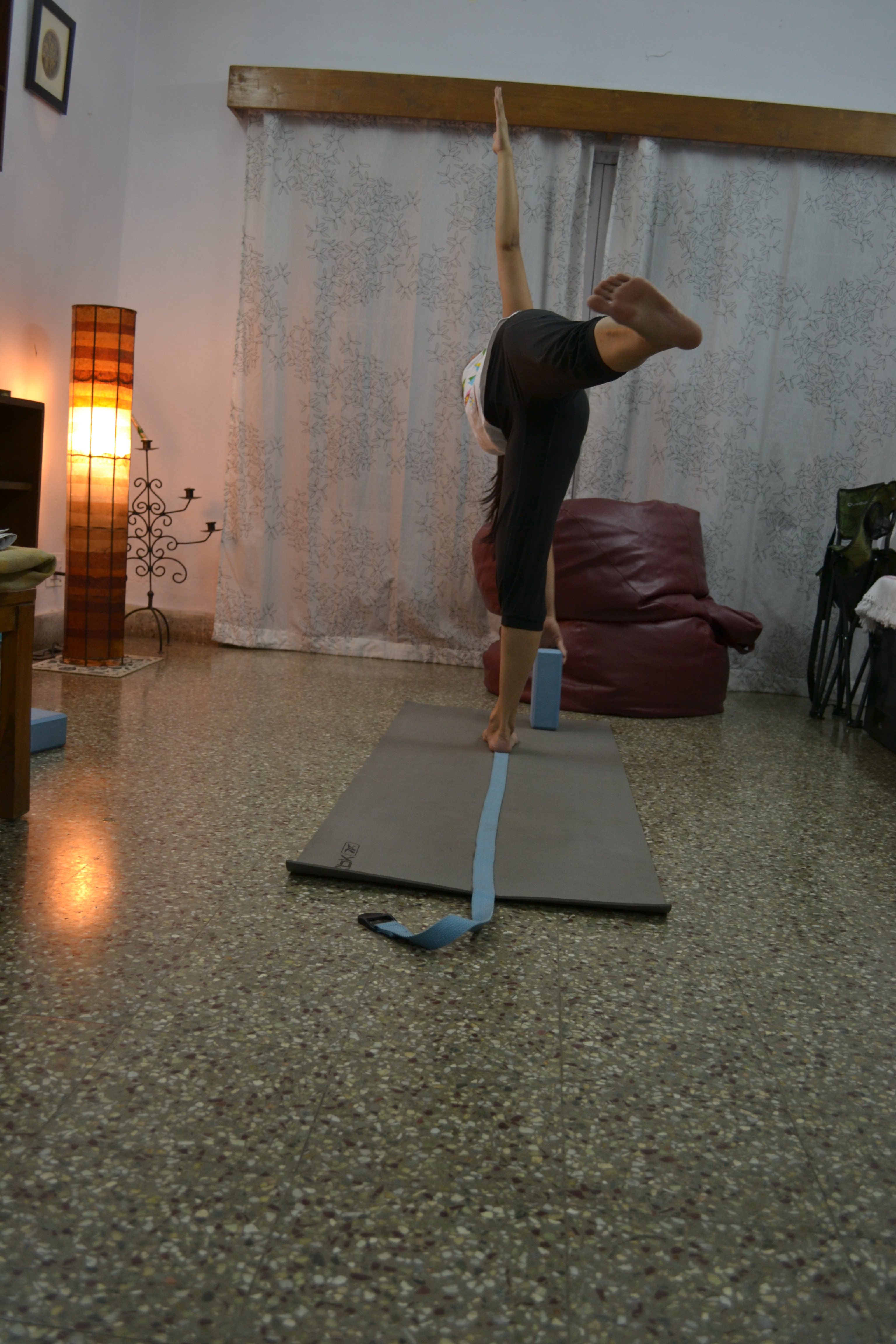 2. Next, place a block about a foot in front and a foot to the side of the belt. Since the Ardhachandrasana is about balance as well as an extension of the spine and torso, you will need the block for support.