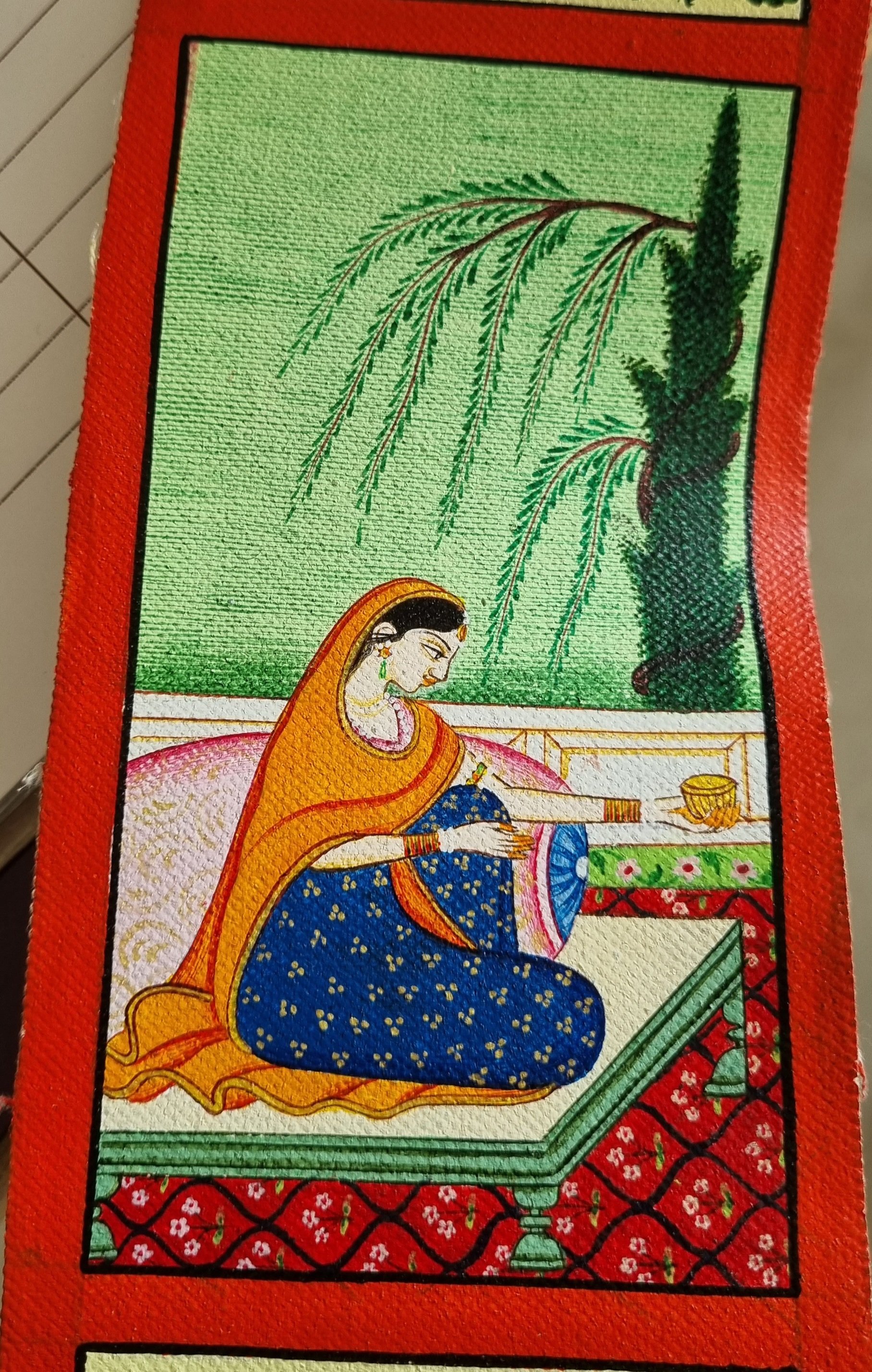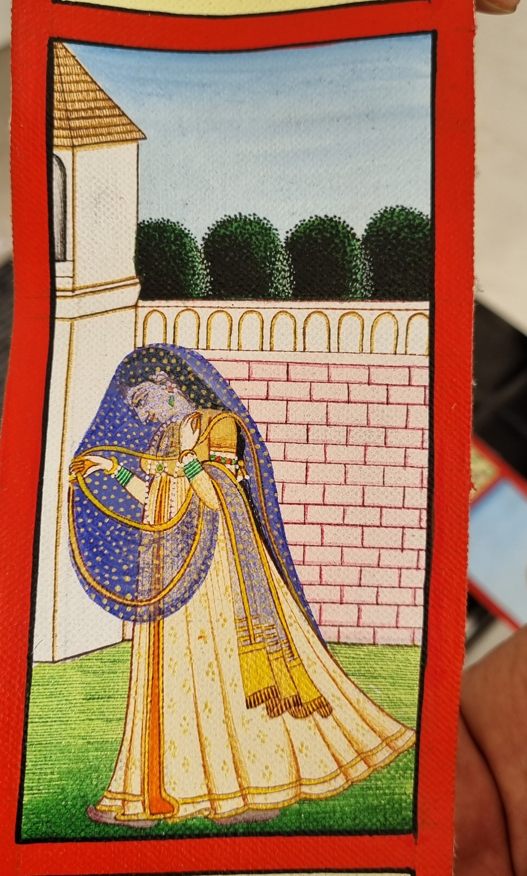 In contrast to the Yogini paintings at the Museum – the paints here depict Bhakti yoga.  Women are beautiful, delicate and finely adorned.  They are depicted as handing out a glass of water, busy with worship or needlework, or playing and instrument.  Note the eyes and faces shyly downcast.  The male figure is conspicuous by its absence.